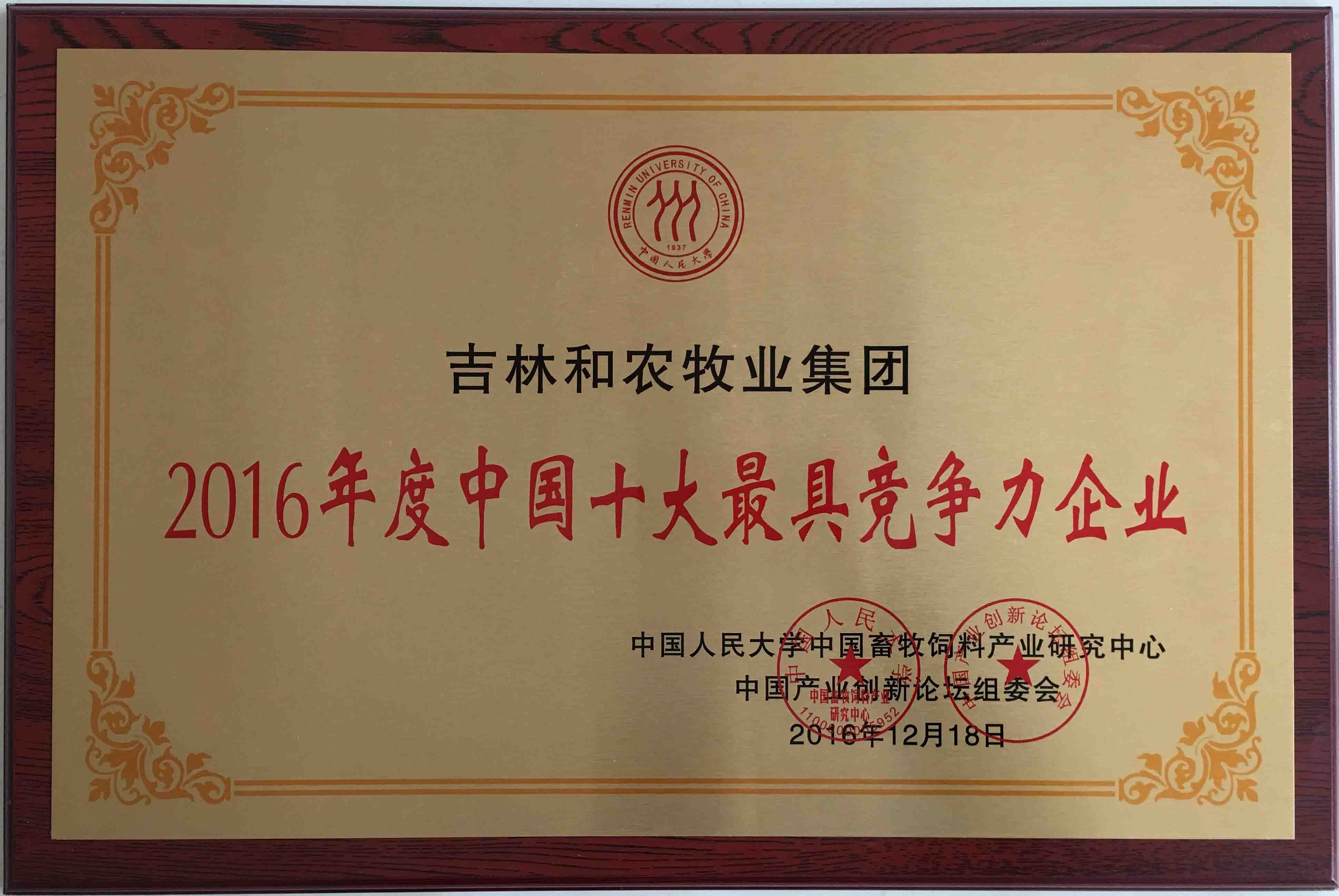 2016年12月18日 熱烈祝賀和農(nóng)牧業(yè)集團(tuán)榮獲2016年度中國十大最具競爭力企業(yè)